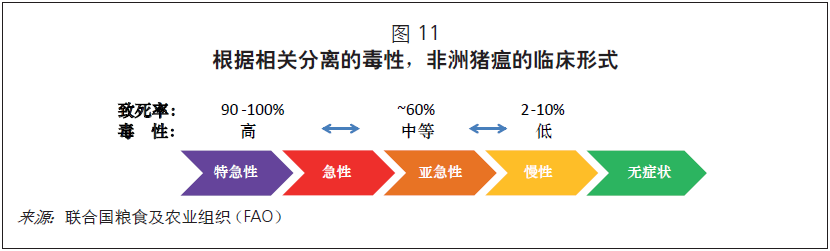 與ASFV 感染相關(guān)的臨床體征具有高度可變性( 見(jiàn)表3),這取決于多種因素:病毒致病力、豬的品種、暴露途徑、感染劑量和該地區(qū)的流行狀況。根據(jù)其毒力,ASFV 分為三個(gè)主要類別:高毒力毒株、中等毒力毒株和低毒力毒株( 圖11)。ASF 的臨床表現(xiàn)形式從特急性( 非常急) 到無(wú)癥狀( 不明顯)。如圖11 所示,高毒力的ASFV 引發(fā)特急性和急性癥狀,中等毒力毒株引發(fā)急性和亞急性的癥狀。