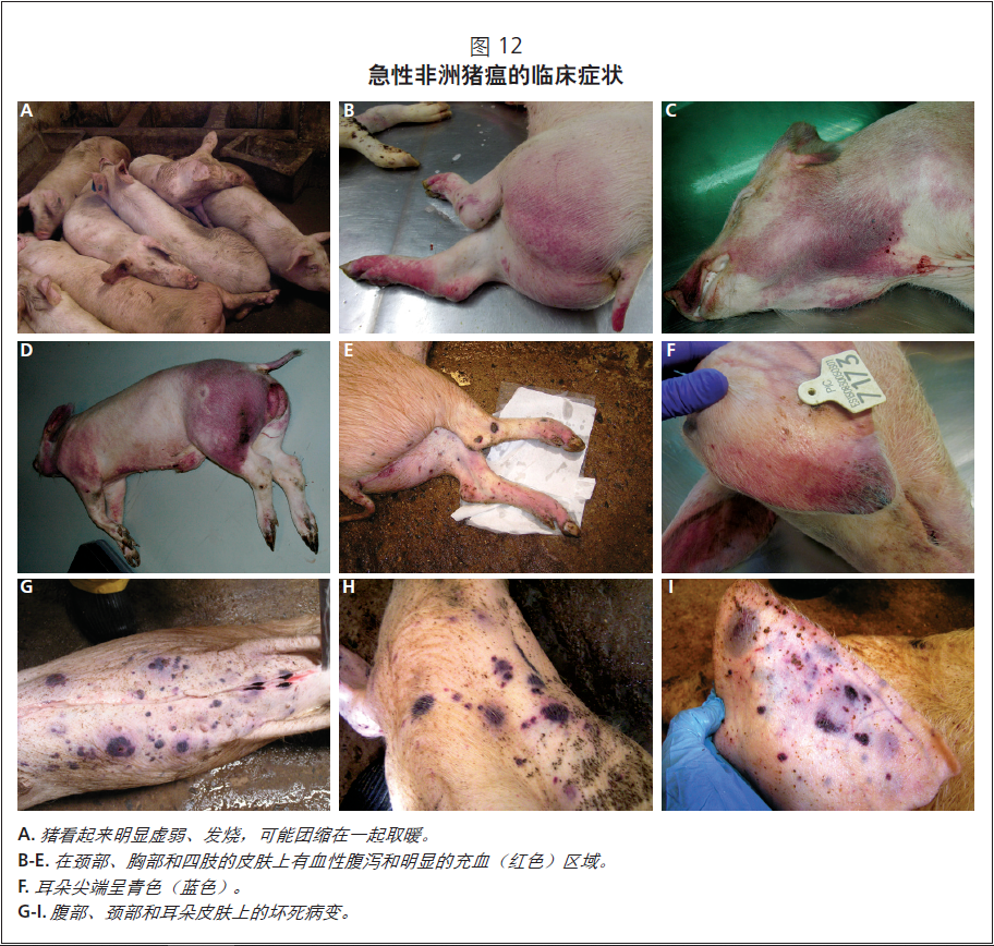 在4-7 天( 極少情況下,可長(zhǎng)達(dá)14 天) 的潛伏期后,患有急性ASF 的動(dòng)物出現(xiàn)發(fā)熱40-42℃,食欲不振:動(dòng)物看起來(lái)嗜睡而且虛弱,蜷縮在一起( 圖12),呼吸頻率增加。對(duì)于高毒力毒株感染,死亡常發(fā)生在6-9 天之內(nèi),中等毒力毒株感染死亡通常為11-15 天。家養(yǎng)豬的致死率往往接近90-100%。在野豬和野生家豬中也有同樣的現(xiàn)象。急性形式容易與其他疫病相混淆,主要是經(jīng)典豬瘟、豬丹毒、沙門氏菌病以及其他原因引起的敗血癥( 見(jiàn)下一章鑒別診斷)。受感染的豬可能會(huì)不同程度地表現(xiàn)出一種或幾種不同比例的臨床癥狀: