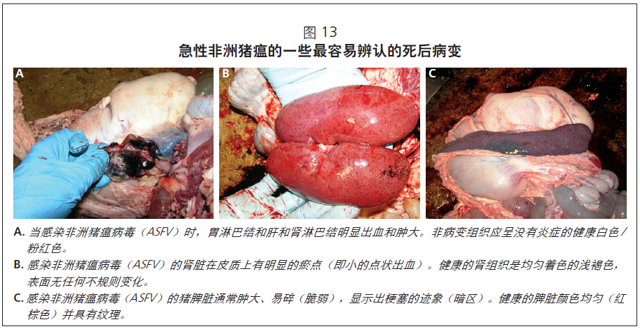 由于皮膚較深和毛發(fā)較濃密,皮膚上的顏色變化和出血很容易就被忽視。深色皮膚的豬品種也是如此。盡管可以觀察到外部臨床癥狀,但死于急性ASF 的豬的尸體也可能表觀身體狀況良好,最明顯的剖檢病變( 圖13) 是:淋巴結(jié)( 特別是胃腸和腎) 增大、水腫以及整個(gè)淋巴結(jié)出血,形態(tài)類似于血塊; 脾臟增大、脆化,圓形邊緣變深紅色甚至黑色;以及在腎臟包膜上的瘀點(diǎn)( 斑點(diǎn)狀出血)。