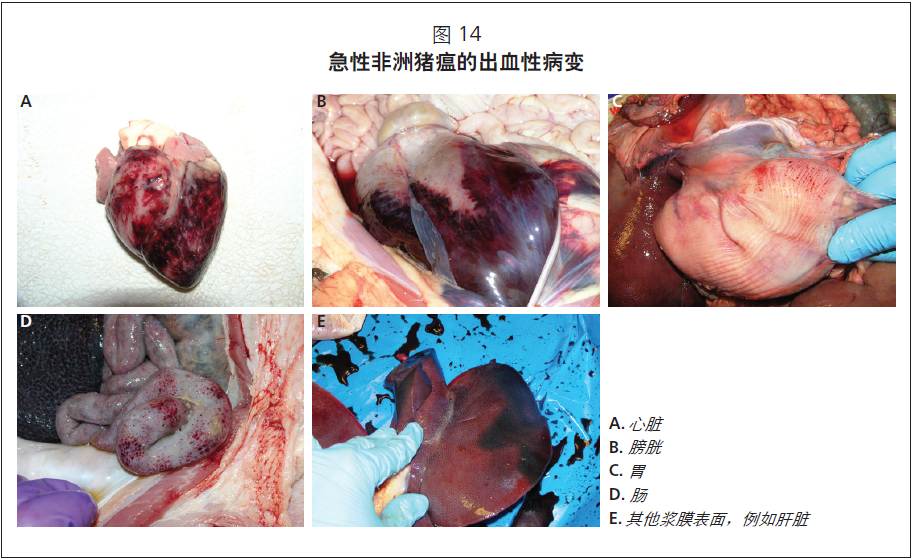 5. 瘀點(diǎn)、瘀斑( 較大的出血),胃、小腸和大腸中過(guò)量的凝血( 圖14);