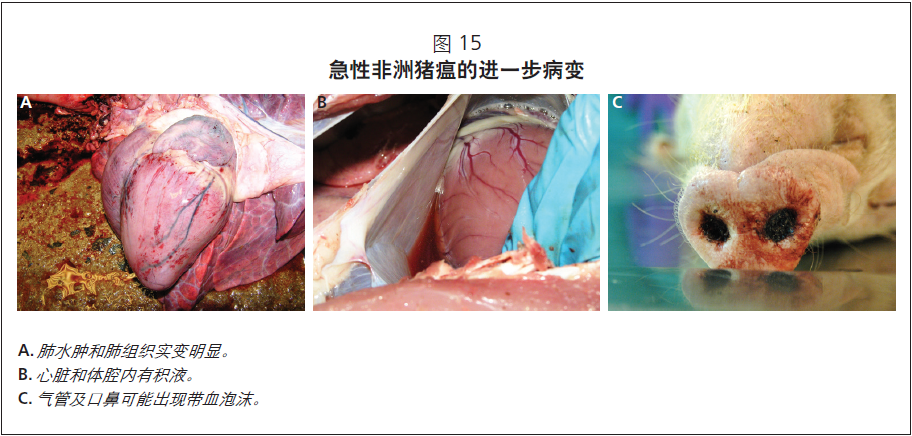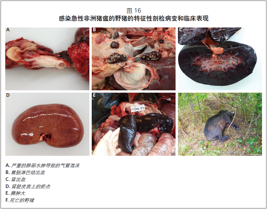 在東歐,受感染的歐洲野豬,盡管由于厚重且深色的皮毛,導(dǎo)致眼觀可見(jiàn)的癥狀不太明顯,但仍表現(xiàn)出同樣的臨床癥狀和剖檢病變( 圖16)。