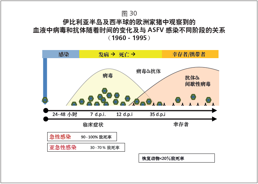 根據報道,ASF 的自然感染潛伏期為4~19 天。在臨床癥狀出現的兩天前,ASF 感染動物開始散播大量病毒。病毒散播因所感染的ASFV 毒株毒力不同而異。感染后約7-9 天血清轉陽,抗體陽性可持續終生( 圖30)。
