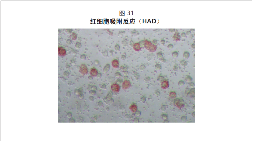 病毒分離是將樣品接種易感的豬源原代細胞、單核細胞和巨噬細胞而進行的檢測。如果在樣品中存在ASFV,則會在易感細胞中復制,在感染細胞中產生細胞病變(CPE)。細胞裂解和細胞病變(CPE) 通常在出現紅細胞吸附現象的48-72 小時后發生。ASFV 的紅細胞吸附試驗是該病毒特有的檢測技術,其他豬源病毒在白細胞培養物中不存在紅細胞吸附特性。當病毒在這些培養物中復制時,多數ASFV 毒株會產生紅細胞吸附反應(HAD),在感染的白細胞周圍吸附豬紅細胞形成 “玫瑰花環”( 圖31)。