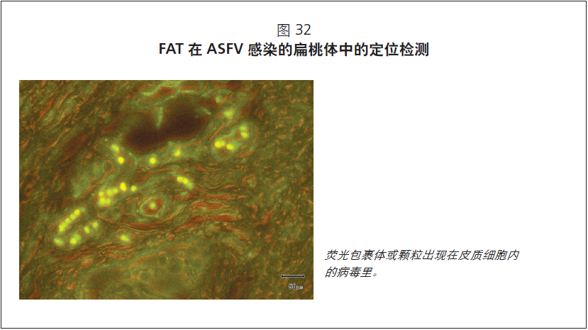 FAT 可用于檢測豬組織中的ASFV 抗原。檢測原理是通過顯微觀察感染臟器涂片或薄層冷凍切片上的病毒抗原實現的。使用異硫氰酸熒光素(FITC)結合的特異性抗體檢測細胞內抗原。FAT 也可用于檢測未觀察到HAD 的白細胞培養物中的ASFV 抗原,因此可以鑒定不產生HAD 反應的ASFV 毒株。FAT 還可用于鑒別CPE 是由ASFV 感染導致的,還是由其他病毒感染或者導致的接種的細胞毒性導致的。