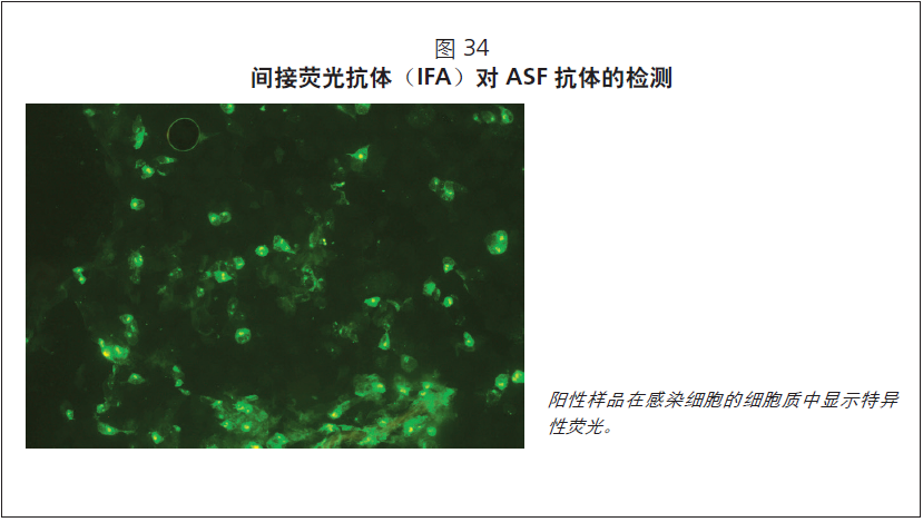 該技術的原理是用具有細胞適應性的ASFV 毒株,感染單層綠猴腎細胞,再通過特異性抗原抗體反應實現對ASF 抗體的檢測。抗原抗體反應通過耦聯的熒光素進行檢測。陽性樣品在感染細胞的胞漿中出現特異性熒光。IFA 是一種快速、高度敏感和特異的ASF 抗體檢測技術,適用于血清、血漿或組織分泌物中抗體的檢測。